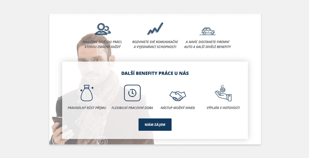 1 ) Vytvořili jsme jednoduché webové stránky (od wireframe přes grafiky, copywriting až po samotné kódování), na kterých jsme jasně prezentovali nejdůležitější informace (benefity, reference a další) pro uchazeče o práci.