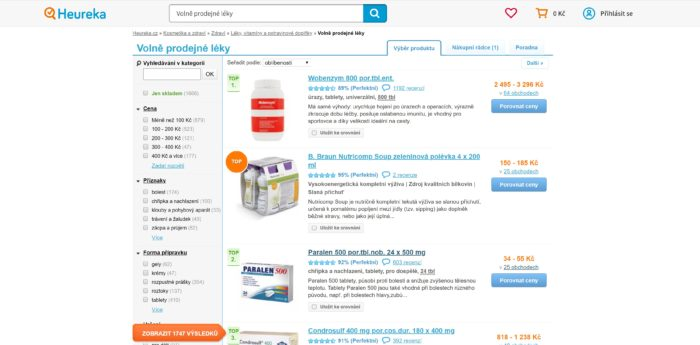 Od Heureky a Zboží.cz jsme se dozvěděli, že pokud jsou léky volně prodejné a nejsou nezákonné, můžete je inzerovat. Takže například takový paralen najdeme hned mezi prvními na Heurece.